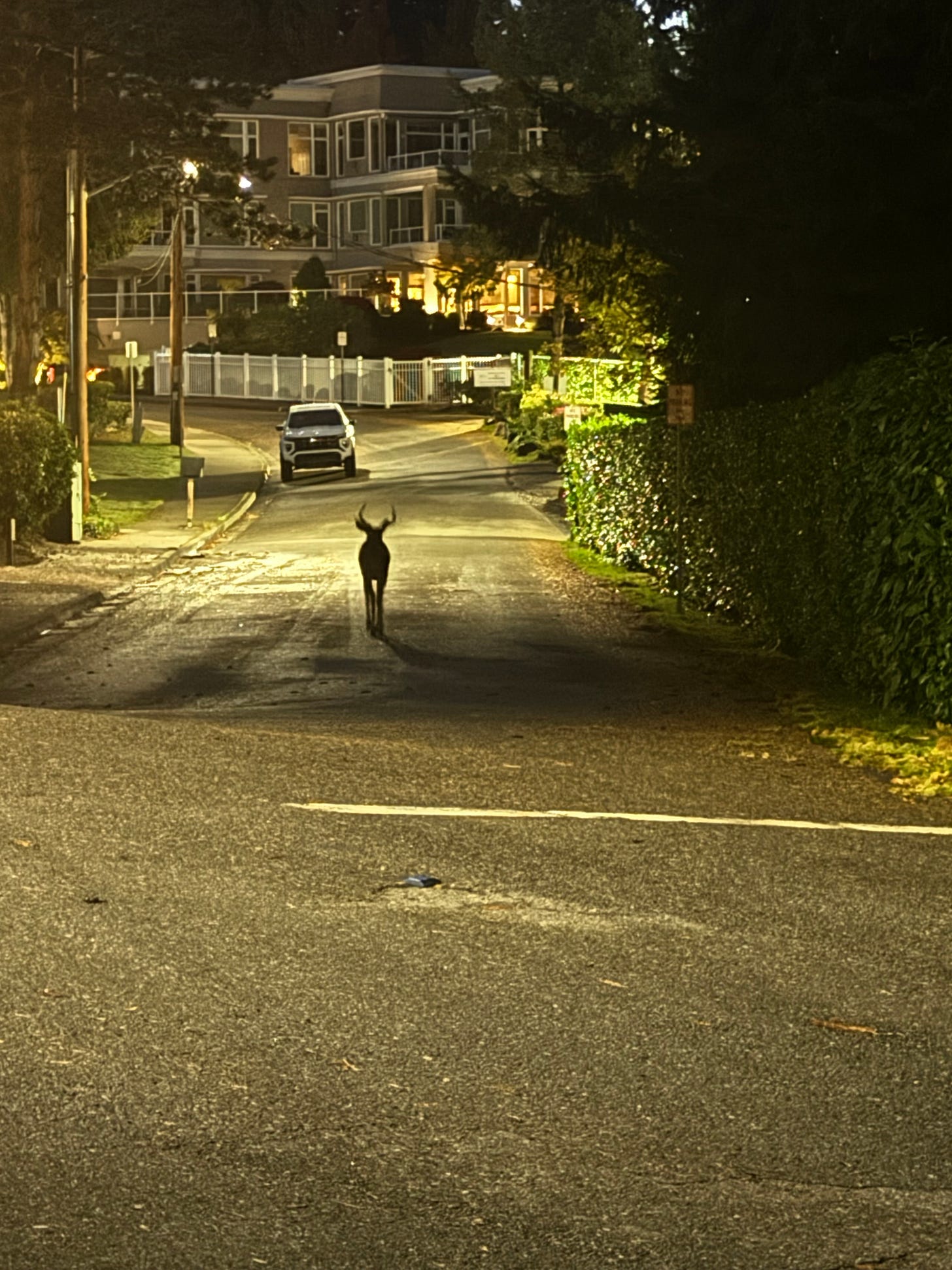 “It’s a deer!” shouted Raj as I was making him quesadillas for breakfast. I grabbed my phone and ran out the door to take a picture. The stag was purposefully striding through the parking lot of my condo. A flock of ducks, geese, and seagulls feeding nearby fly away in unison, making a cacophony from wings flapping in unison in the pre-dawn darkness. He walks past the Meydenbauer Bay Yacht Club right in the center of the road. I fiddle with my phone to zoom in on the picture. When I look up, he has disappeared into the darkness. Did he go left, deeper into the city, or right, where there is a park he can hide in? It’s cold without a coat and in my slippers so I turn around and go back inside.